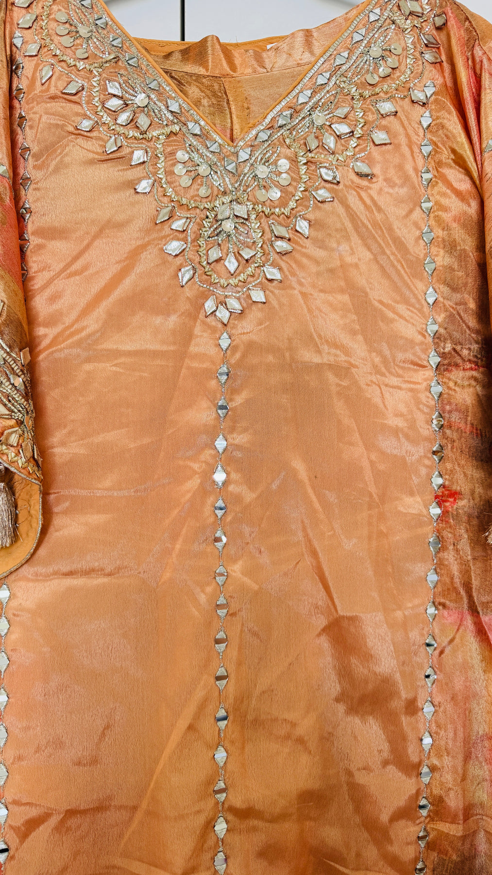 Elevate your festive style with this vibrant golden party wear kaftan set with gotta and tassels along with printed sharara pants. Designed for the modern woman who loves tradition with a twist, this outfit is perfect for Diwali parties, weddings and festive get-togethers in the UAE.